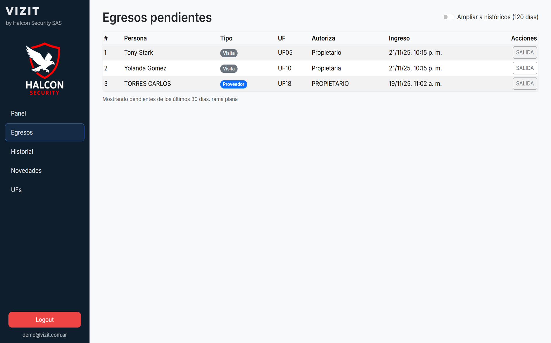 Supervisores y administración pueden revisar egresos pendientes, historial, novedades y exportar reportes para auditorías y comités de seguridad.
