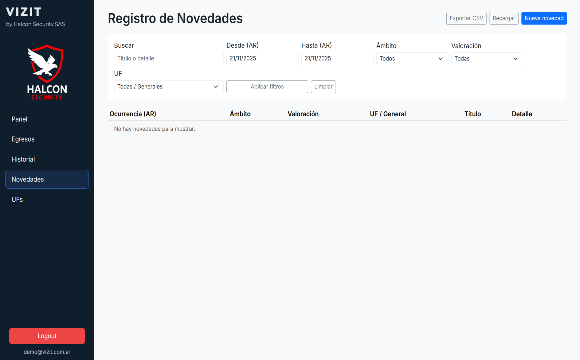 Búsquedas por rango de fechas, tipo, unidad funcional o texto libre. Exportación a CSV para informes, auditorías y respaldos.