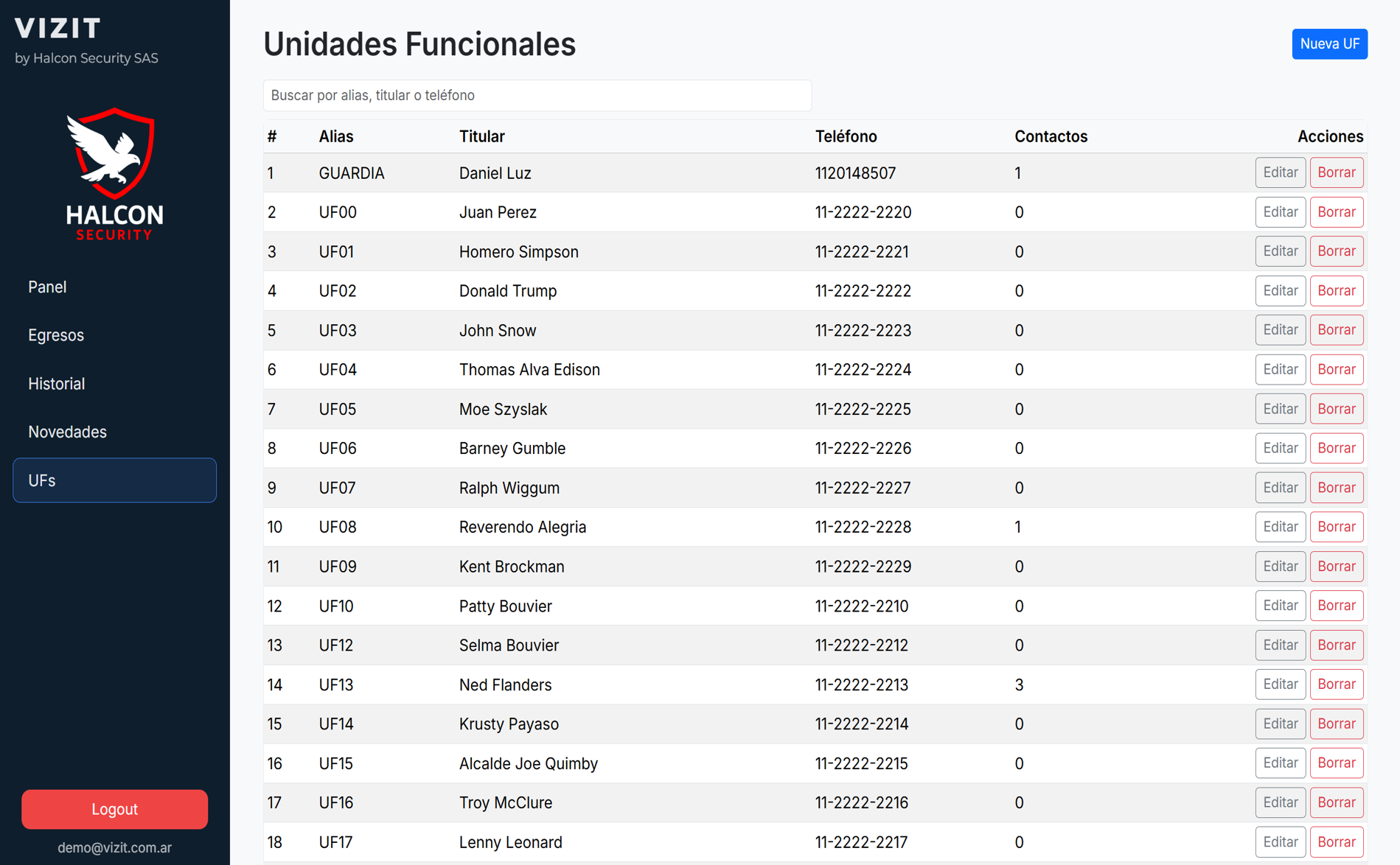 Padrón de unidades funcionales con alias, titulares y teléfonos. Búsqueda rápida, edición y borrado controlado para mantener la información siempre actualizada.